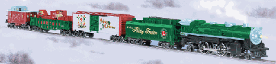 4-4-2 steam locomotive and tender, Christmas Music Boxcar, playing your favorite Christmas Carols, Elf and reindeer animated gondola, 8 pieces of straight track and 8 pieces of curved track, CW-80 watt transformer/controller, smoke fluid.